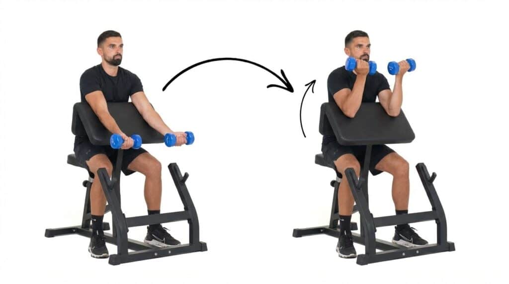 En calant vos bras sur le pupitre, vous supprimez toute possibilité d’élan. C’est un exercice d’isolation pure qui cible le chef court et force le muscle à travailler en position raccourcie.