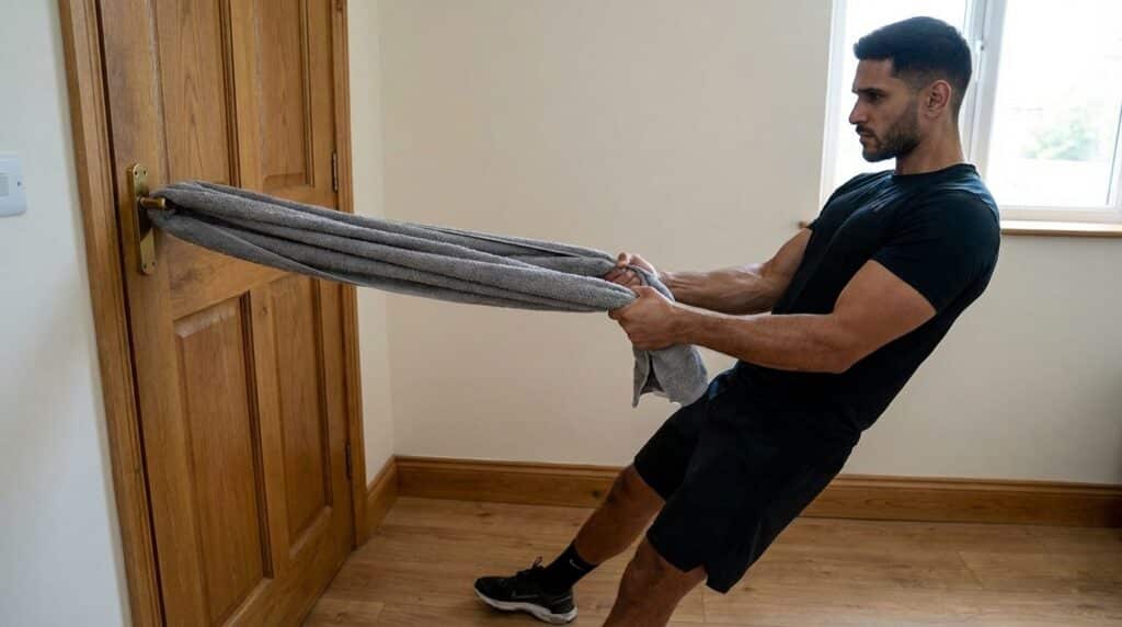 Glissez une serviette autour d’une poignée de porte solide ou d’un poteau. Saisissez les extrémités, penchez-vous en arrière et tirez votre corps vers la porte en pliant les bras. Plus vos pieds sont avancés, plus c’est difficile.