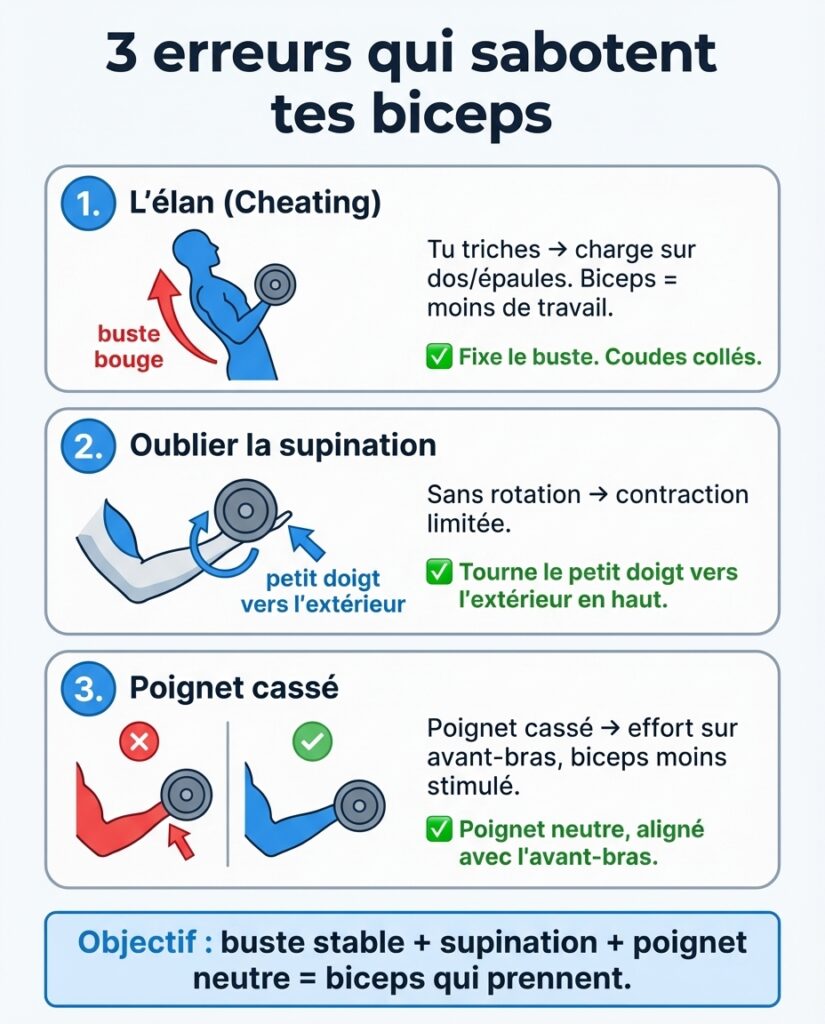 1. L’élan (Le « Cheating ») : C’est l’erreur numéro 1. Balancer le buste d’avant en arrière transfère la charge sur le bas du dos et les épaules. Vos biceps travaillent moins, et votre colonne vertébrale souffre.