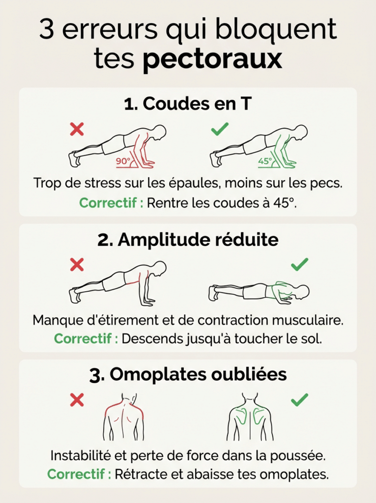C’est souvent parce que les épaules ou les triceps prennent le relais. Pour corriger cela : sortez la cage thoracique, resserrez vos omoplates, et concentrez-vous sur l’idée de rapprocher vos coudes l’un de l’autre lors de la poussée.