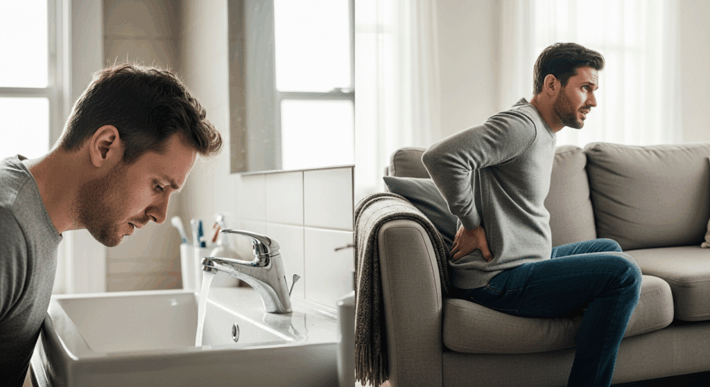 • Maux et douleurs : maux de dos (pour lesquels des exercices de renforcement du dos à la maison peuvent être bénéfiques), de tête, douleurs dentaires, crampes dans les jambes. Parfois, des douleurs peuvent même être ressenties au niveau de l’abdomen, simulant des contractions légères.