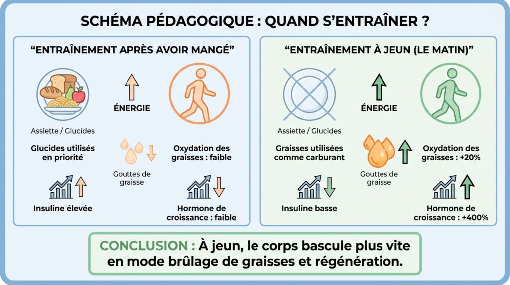 Pour comprendre la puissance de cette méthode, il faut imaginer notre corps comme une voiture hybride. Après un repas, il fonctionne principalement à l’énergie rapide des glucides (le glycogène). Mais après une nuit de jeûne, ce réservoir est presque vide. Le corps bascule alors intelligemment sur sa source d’énergie la plus abondante : les graisses stockées.