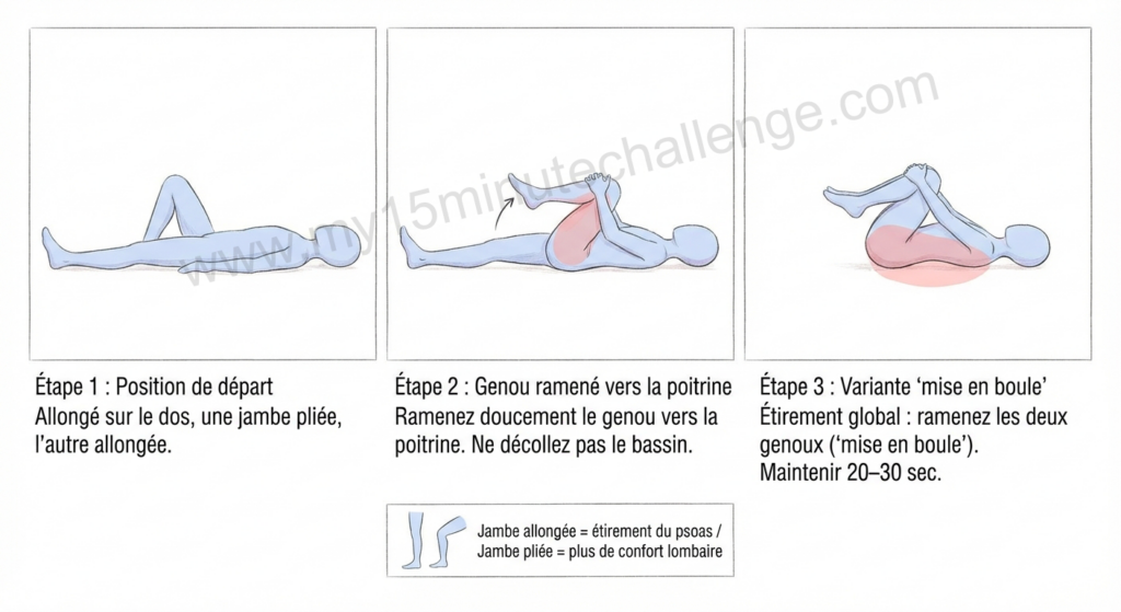 - Maintenez 20 à 30 secondes. Répétez avec l’autre jambe, puis avec les deux genoux en même temps (« mise en boule »).