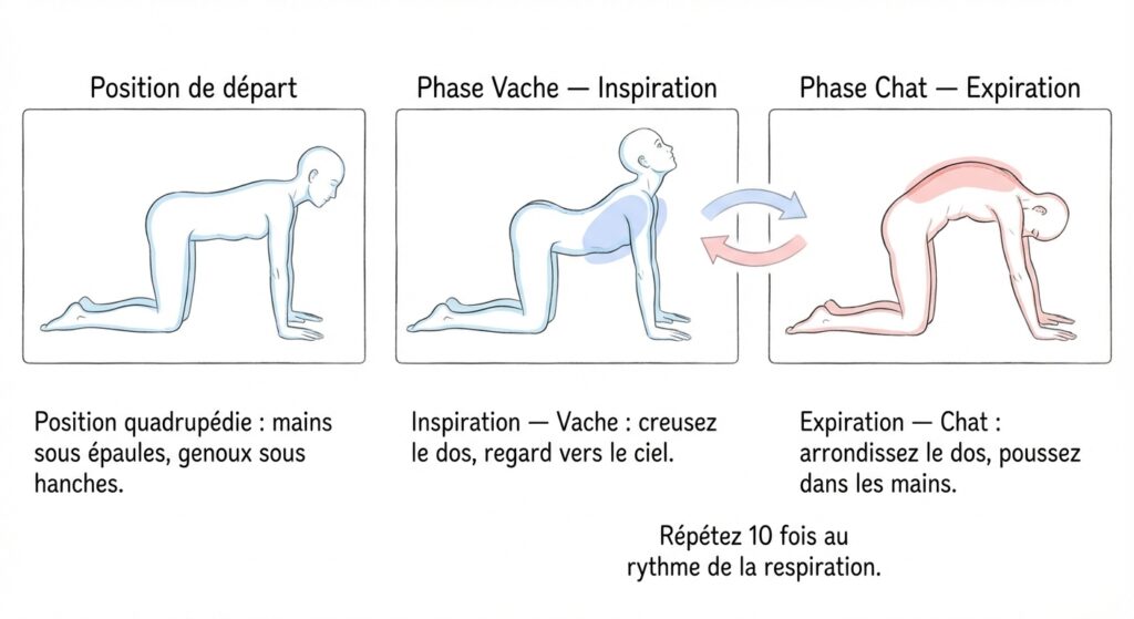 Le yoga est un outil formidable pour la santé du dos, à condition de l’adapter. La posture du Chat-Vache (Marjaryasana-Bitilasana) est idéale pour mobiliser toute la colonne.