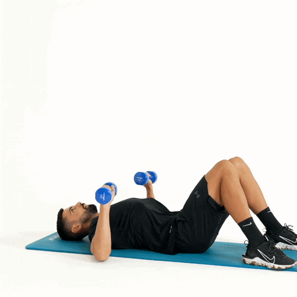 Allongez-vous sur le dos, directement sur le sol. Pliez vos jambes en gardant les pieds à plat au sol, légèrement écartés pour une meilleure stabilité. Prenez un haltère dans chaque main et positionnez-les au-dessus de votre poitrine, bras tendus, paumes orientées vers l’avant. Vos épaules et votre tête doivent rester en contact permanent avec le sol.