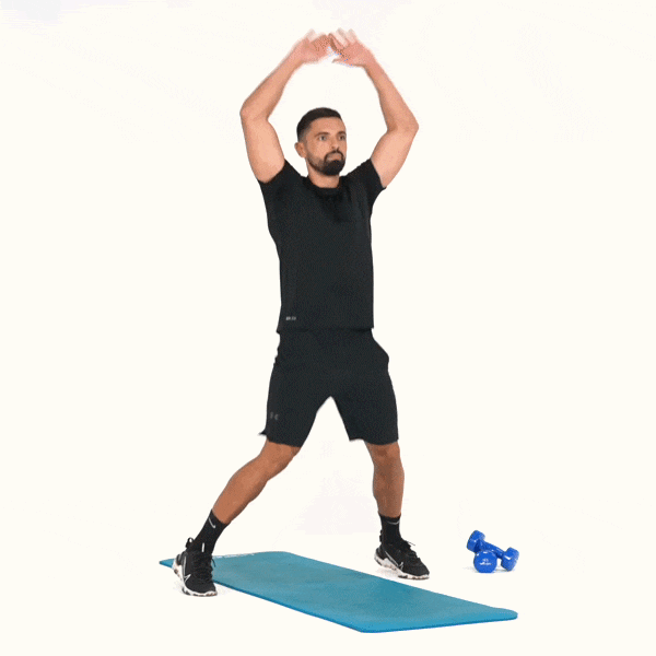 Depuis cette position de départ, effectuez un saut léger en écartant les jambes et en levant les bras de chaque côté du corps. Vos bras doivent se rejoindre au-dessus de votre tête pendant que vos pieds se retrouvent écartés, légèrement plus que la largeur de vos épaules.