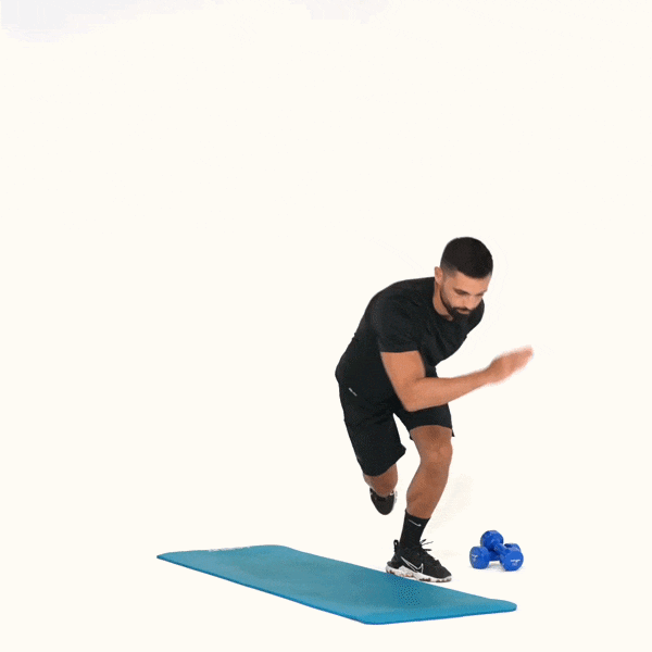 Réalisez une série de sauts latéraux rapides et fluides en alternant de chaque côté. Imaginez que vous glissez sur la glace ou sur des patins à roulettes : le mouvement doit être rythmé, continu et dynamique, mais toujours sous votre contrôle.
