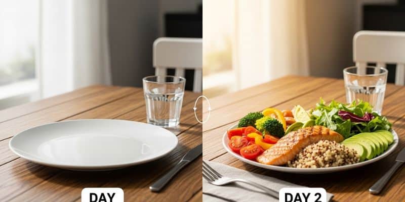 Ne vous lancez pas directement dans un jeûne prolongé. Commencez par un protocole doux comme le 16/8, ou même 12/12 (jeûne de 12 heures, fenêtre de 12 heures), et augmentez progressivement la durée du jeûne à mesure que votre corps s’adapte. Par exemple, si vous terminez de manger à 20h, visez d’abord un premier repas à 8h le lendemain, puis décalez-le progressivement à 10h, puis à 12h. L’objectif est d’habituer votre corps en douceur à utiliser les graisses comme source d’énergie.