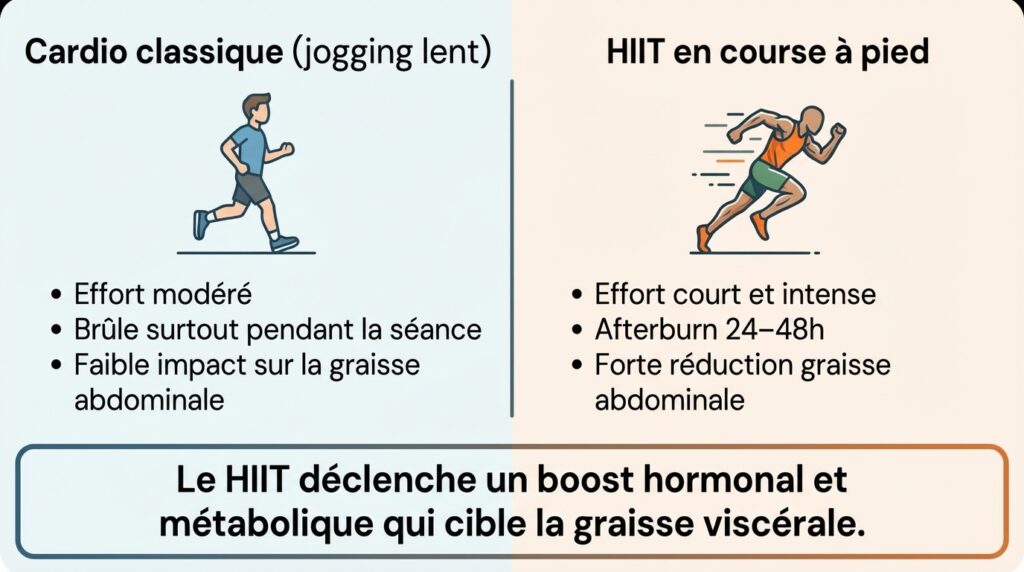 L’éternel débat sur le meilleur sport pour perdre du ventre semble toucher à sa fin. Selon une publication récente du magazine Grazia, la science désigne un vainqueur clair : la course à pied, mais pas n’importe comment. C’est sa pratique sous forme de HIIT (High-Intensity Interval Training), ou entraînement fractionné de haute intensité, qui se révèle être l’arme absolue contre la graisse abdominale. Oubliez les longues sessions de jogging à allure modérée ; la clé réside dans l’alternance de phases de sprint très intenses et de courtes périodes de récupération. Une vaste méta-analyse publiée sur PubMed, regroupant les données de 39 études et 617 participants, a confirmé que le HIIT entraîne une réduction absolue significative de la masse grasse viscérale par rapport à l’endurance classique [1].