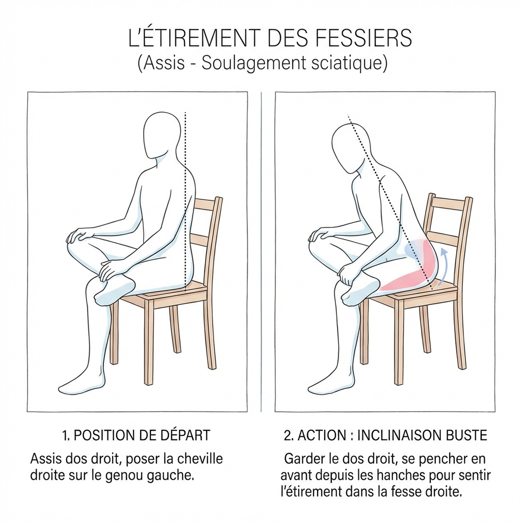 Vous sentirez un étirement profond dans la fesse droite, soulageant le nerf sciatique potentiel.