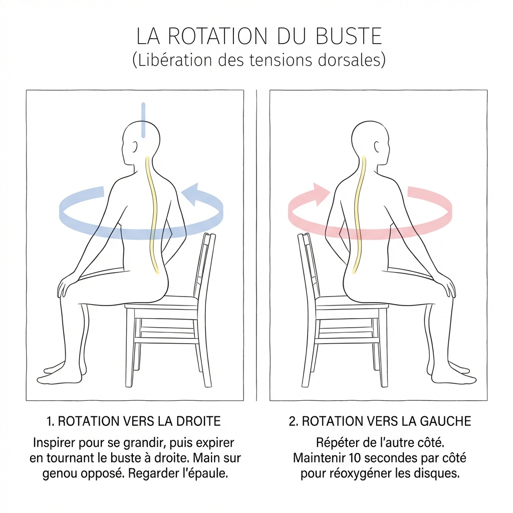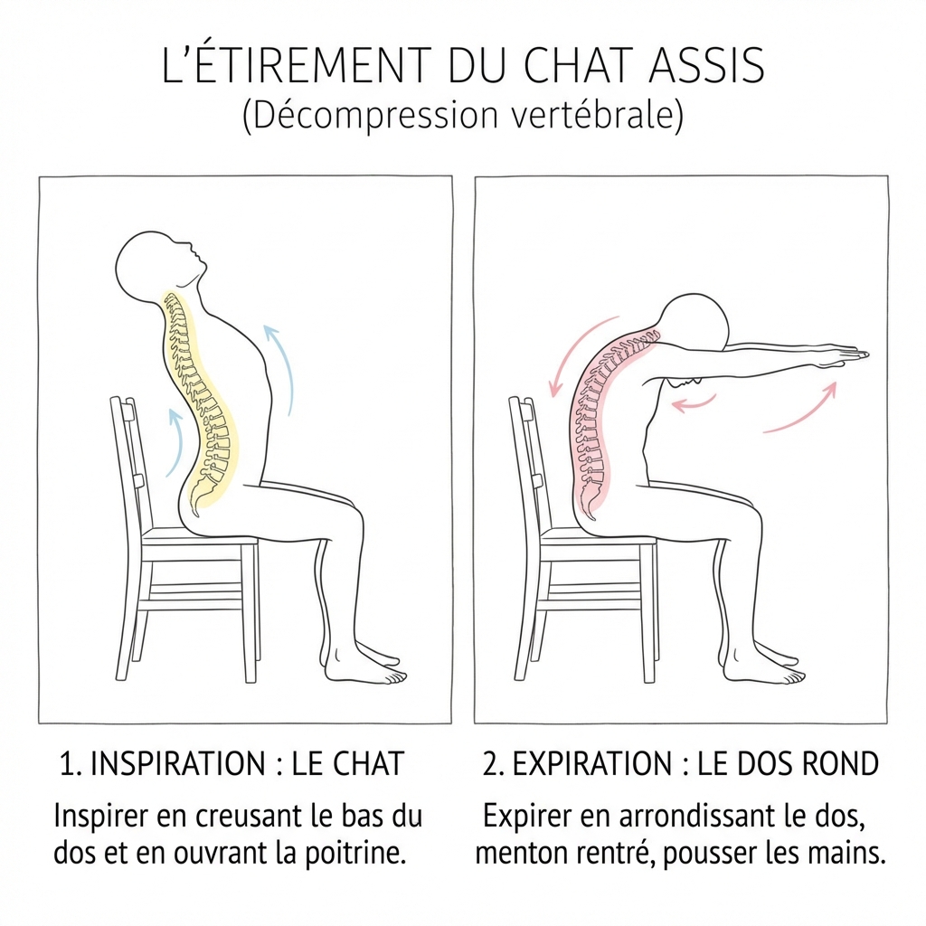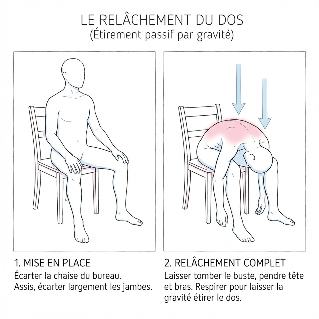 Dès l’apparition de la douleur, il est crucial de ne pas rester figé. Le corps envoie un signal d’alarme. Faites quelques pas ou un étirement ciblé (comme la rotation du buste), puis vérifiez immédiatement si vous n’êtes pas avachi.