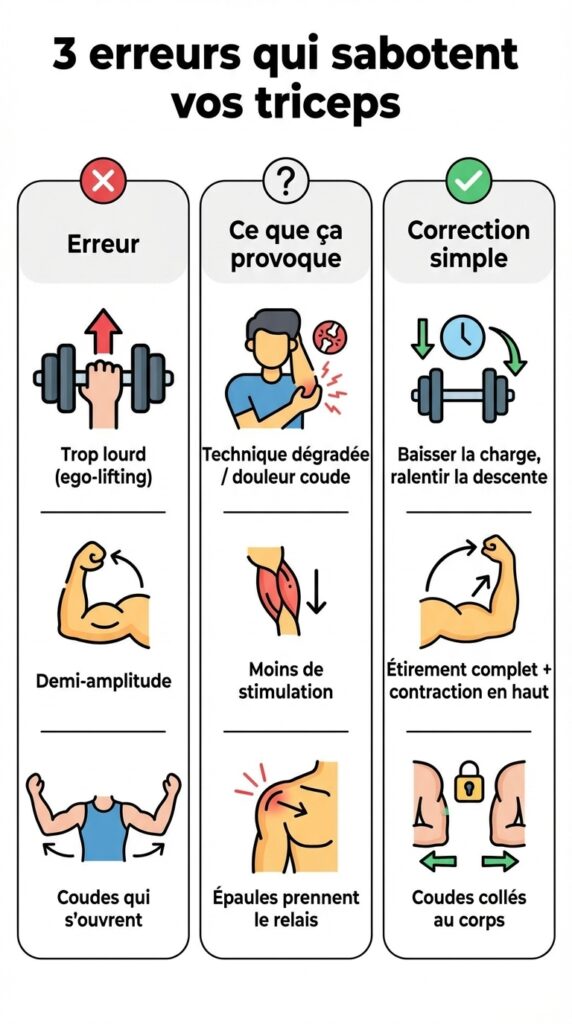 - L’ego-lifting (charges trop lourdes) : C’est l’erreur numéro 1. Vouloir soulever trop lourd dégrade la technique, sollicite les épaules et les pectoraux à la place des triceps, et augmente drastiquement le risque de tendinite au coude.