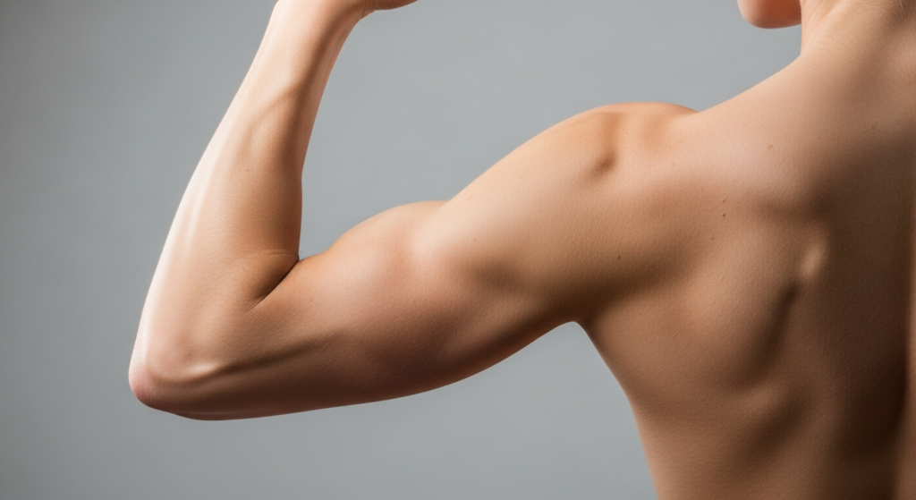 - La longue portion : C’est la partie la plus volumineuse, située à l’arrière du bras. Elle est bi-articulaire (traverse l’épaule et le coude) et donne cet aspect « plein » au bras vu de profil.