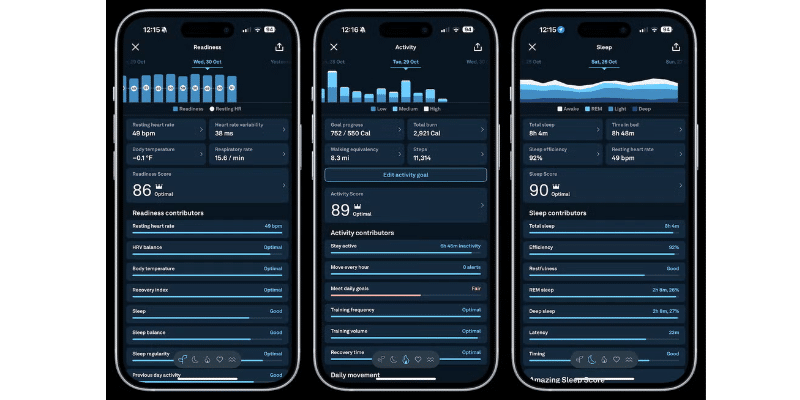 Mais l’aspect financier ne s’arrête pas là. Depuis l’introduction de la Gen3, Oura a adopté un modèle d’abonnement mensuel, facturé environ 6,99€ par mois. Cet abonnement est désormais obligatoire pour profiter de la quasi-totalité des fonctionnalités avancées de la bague. Sans abonnement, l’utilisateur n’a accès qu’aux indicateurs de base (score quotidien, temps de sommeil, fréquence cardiaque), mais perd l’accès aux analyses détaillées du sommeil, à la variabilité de la fréquence cardiaque (HRV), à la température corporelle, aux scores de préparation et d’activité, ainsi qu’aux recommandations personnalisées et à l’historique complet des données. Les mises à jour firmware, bien que techniques, apportent souvent des fonctionnalités qui sont ensuite intégrées à l’abonnement.