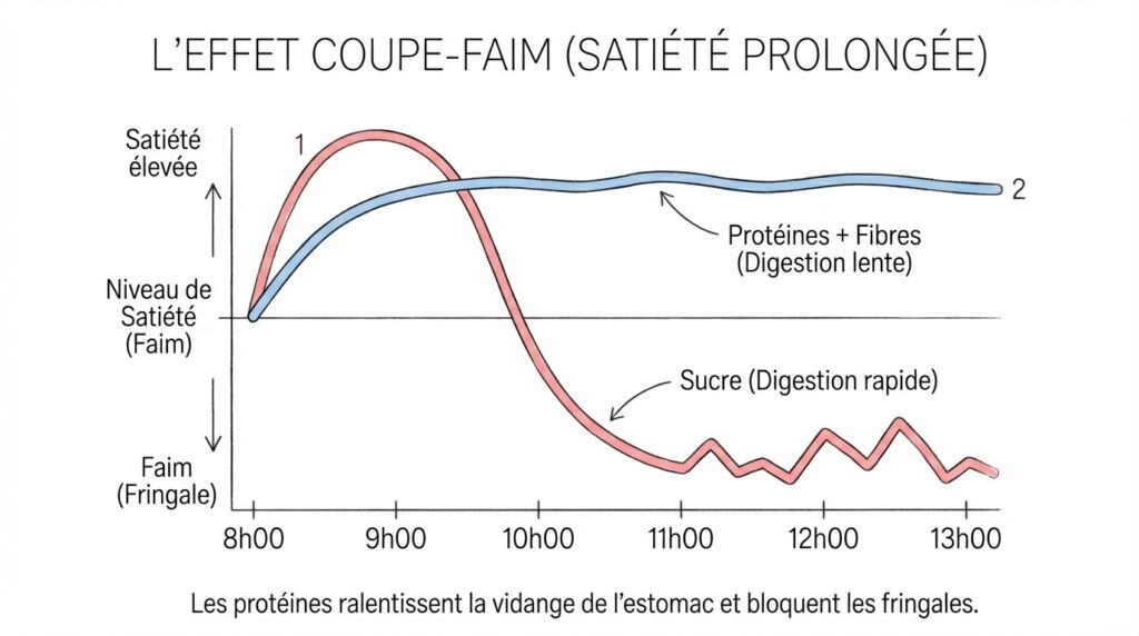 Les protéines sont le macronutriment le plus rassasiant. Elles mettent plus de temps à être digérées que les glucides, ce qui prolonge la sensation de satiété et élimine les fringales de milieu de matinée.