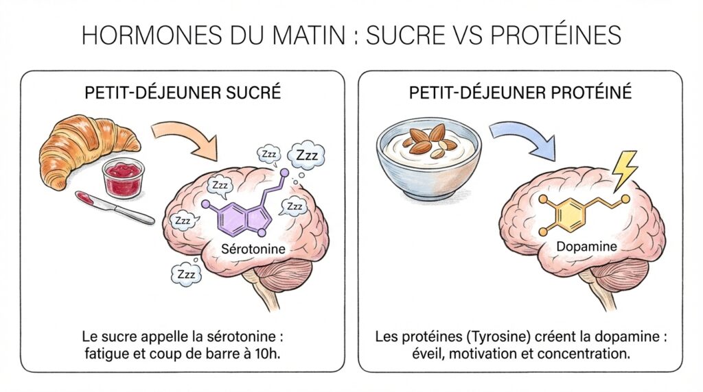 Un petit-déjeuner riche en sucres rapides (céréales, viennoiseries, confiture) fait exactement l’inverse : il stimule la sérotonine, l’hormone de la détente et de l’endormissement. Autrement dit, tu commences ta journée en mode « sieste » plutôt qu’en mode « action ».
