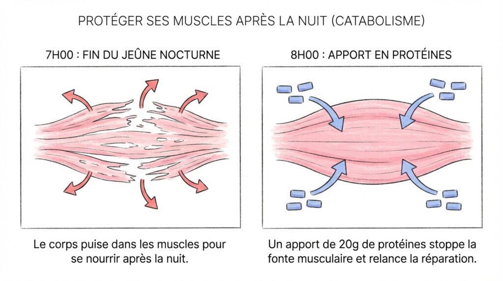 Après une nuit de jeûne (7 à 9 heures sans manger), ton corps est en état de catabolisme : il dégrade ses propres tissus pour se nourrir, y compris du muscle. Les protéines au petit-déjeuner stoppent ce processus et relancent la synthèse protéique musculaire. C’est crucial si tu veux perdre du gras sans perdre de muscle — la clé d’une perte de poids durable et esthétique.