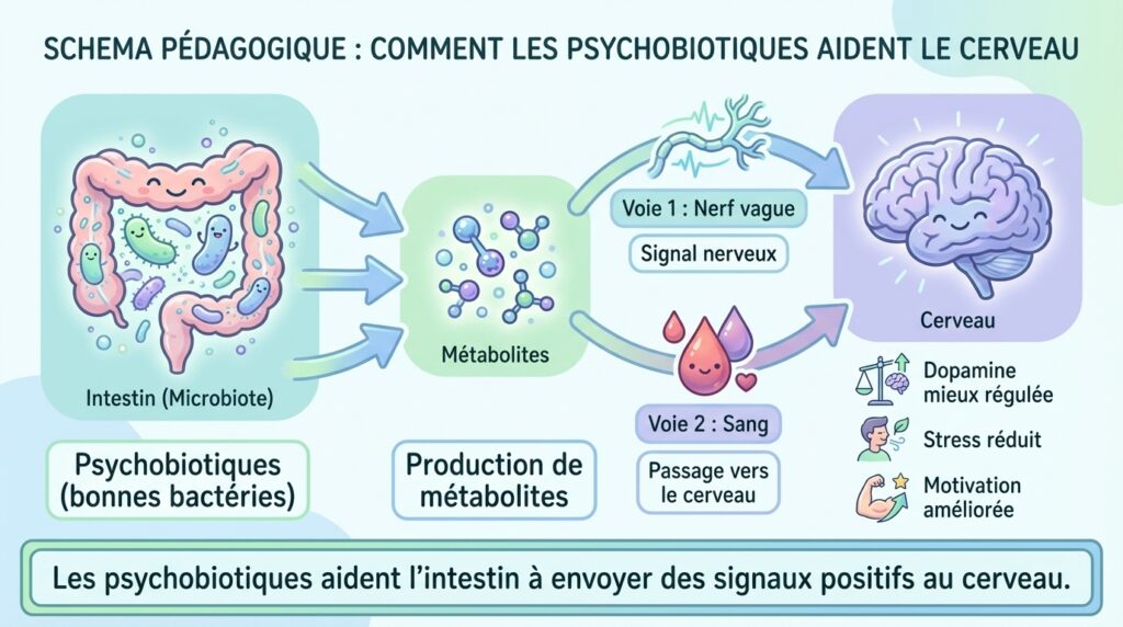 Un psychobiotique est un micro-organisme vivant (probiotique) ou une substance (prébiotique) qui, ingéré en quantité adéquate, produit un bénéfice pour la santé mentale. Contrairement aux probiotiques classiques visant la digestion, les psychobiotiques ciblent spécifiquement l’axe intestin-cerveau pour influencer positivement l’humeur, le stress ou l’anxiété, comme le démontre l’étude de l’Institut du Cerveau de décembre 2025 [1].
