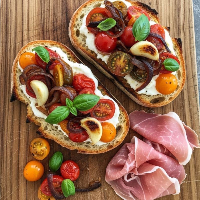 - Étaler la burrata sur les tranches de pain grillées, ajouter la préparation aux tomates.