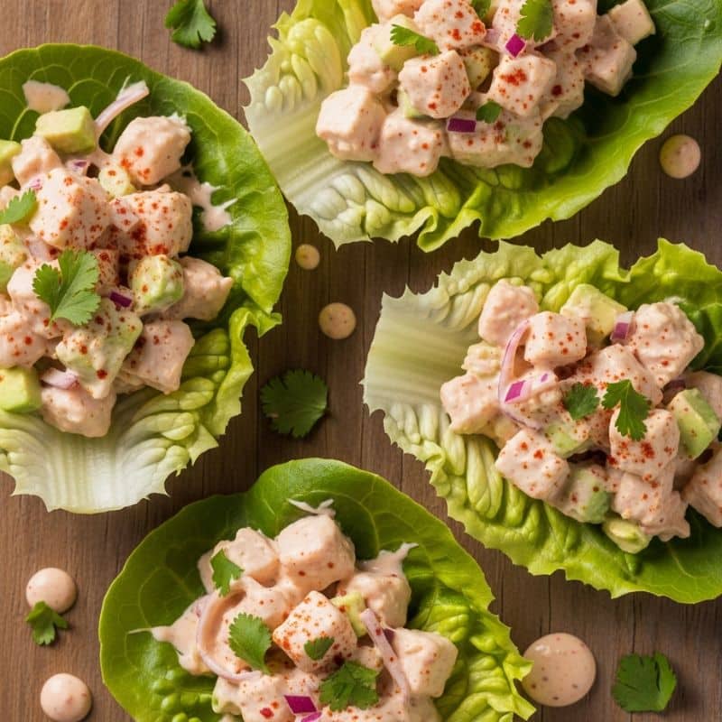 - Disposer les feuilles de laitue à plat, garnir chaque feuille d’une portion généreuse de salade de poulet à l’avocat puis parsemer d’herbes fraîches hachées.