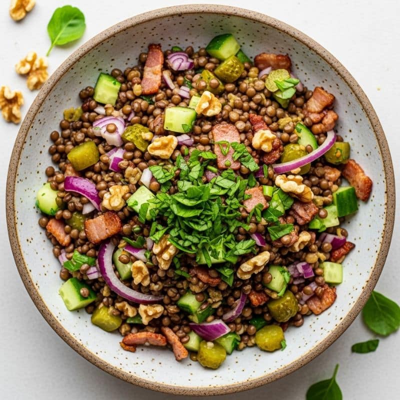 - Dans un saladier, ajouter les lentilles égouttées, les légumes coupés, les noix concassées, le sel, le poivre, la ciboulette et la coriandre.