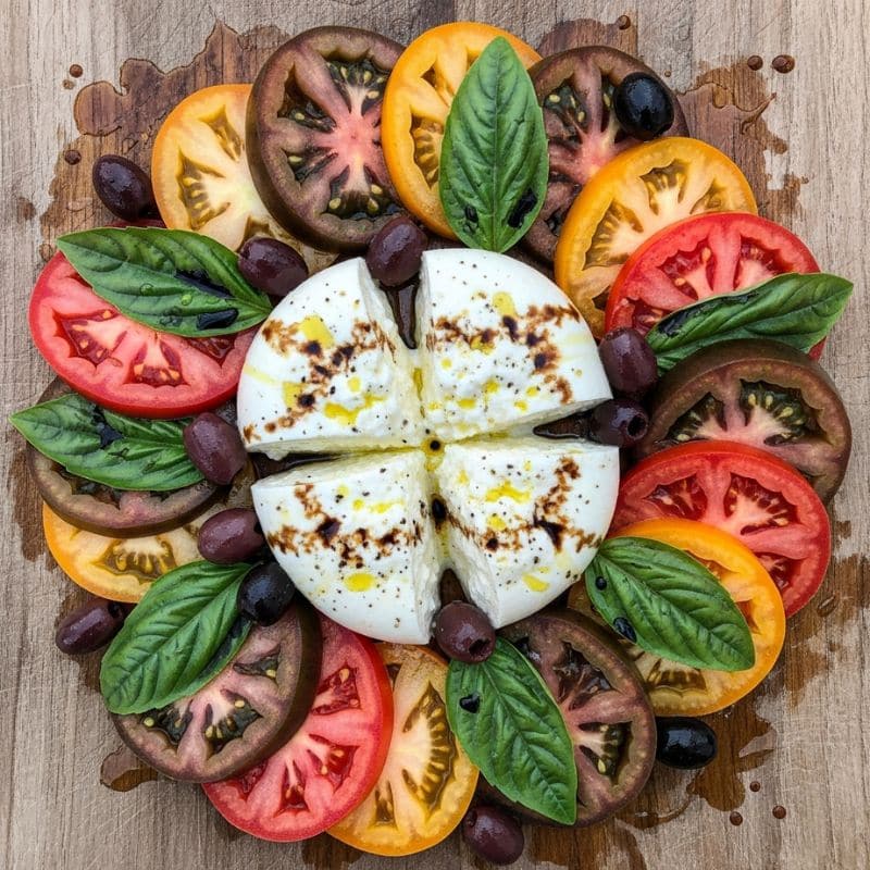 - Parsemez les olives noires et les feuilles de basilic sur le dessus des tomates.