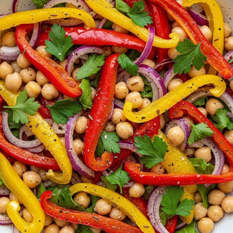 - Déposer les pois chiches, les poivrons, l’oignon et le persil dans un grand saladier.