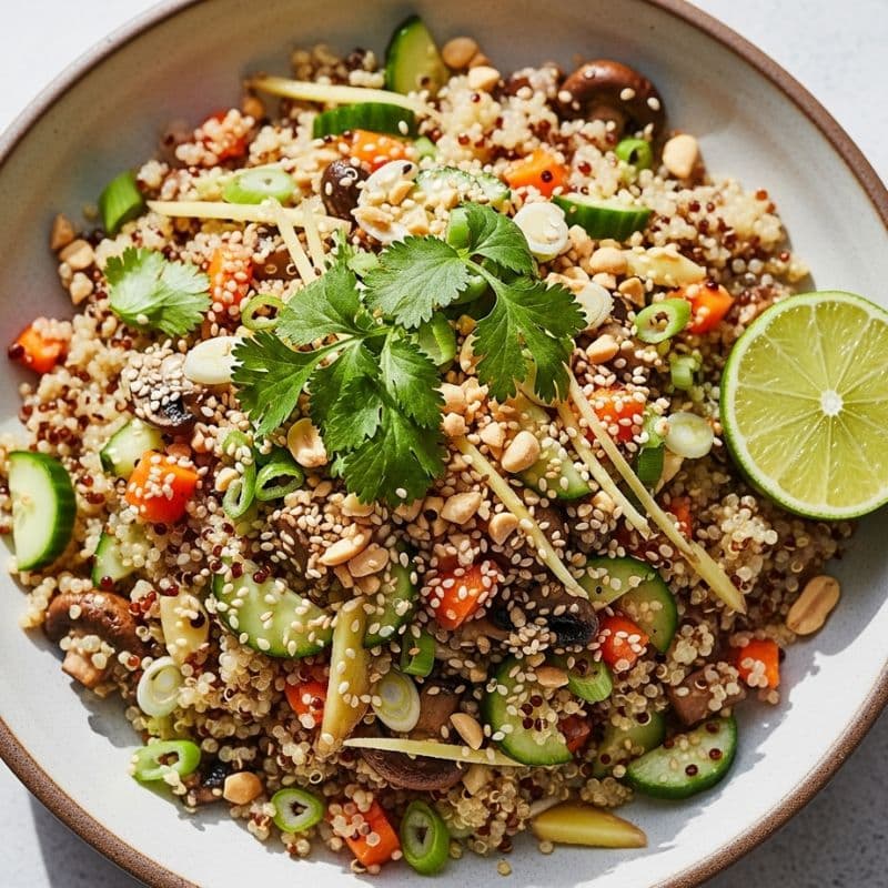 - Ajouter le quinoa cuit et refroidi à la préparation. Parsemer de graines de sésame, d’un filet de jus de citron vert et de la vinaigrette.