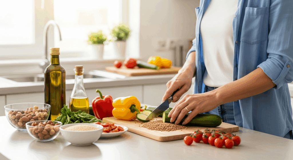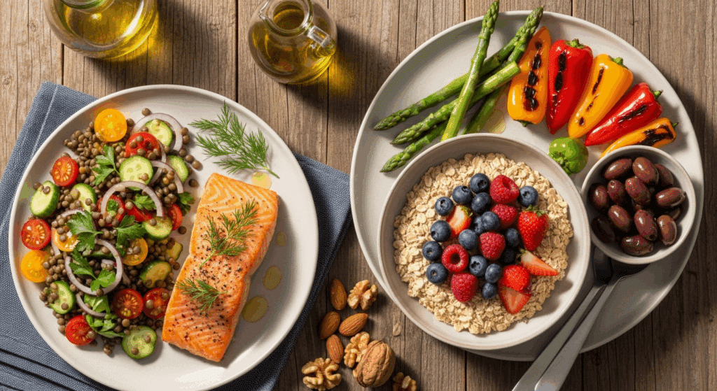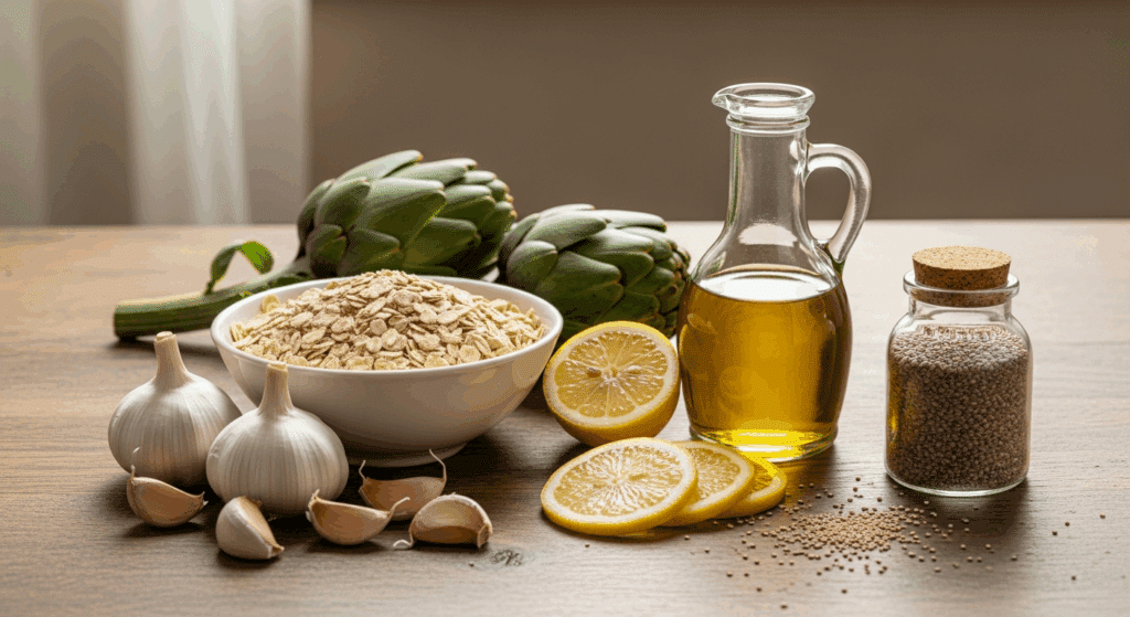 Explication : Les flocons d’avoine, les légumineuses (lentilles, pois chiches), les noix et graines (amandes, lin, chia), les poissons gras (saumon, maquereau), l’huile d’olive extra vierge, ainsi que les fruits et légumes colorés, ont démontré leur effet bénéfique sur le profil lipidique en réduisant le cholestérol LDL et/ou les triglycérides.