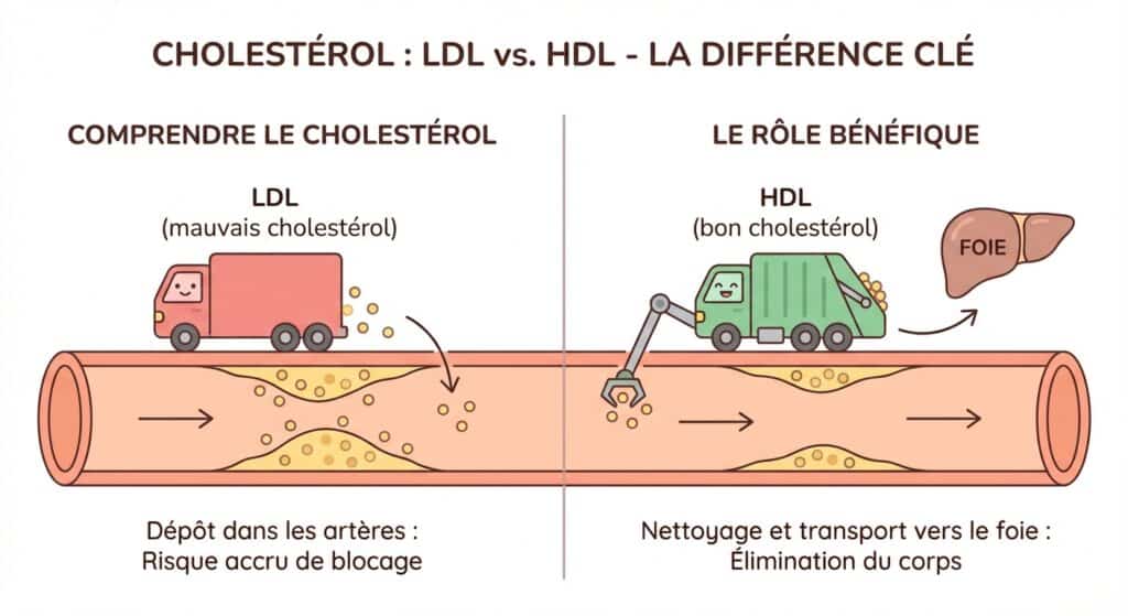 Pour simplifier, imaginez le cholestérol comme un matériau de construction et les lipoprotéines comme des véhicules. Le cholestérol LDL (Low-Density Lipoprotein) est souvent surnommé le « mauvais cholestérol ». Ses transporteurs ont tendance à déposer l’excès de cholestérol sur les parois des artères, formant des plaques qui peuvent les durcir et les rétrécir (athérosclérose). C’est un peu comme des camions de livraison qui laisseraient leur cargaison en vrac sur le bord de la route, créant des embouteillages. Un taux élevé de cholestérol LDL est un facteur de risque majeur pour les maladies cardiovasculaires.