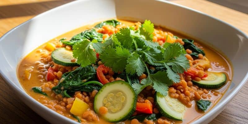Un plat végétarien riche en protéines végétales et en fibres. Préparez un curry léger avec des lentilles corail, du lait de coco allégé, et des légumes comme des épinards, des poivrons et des courgettes.