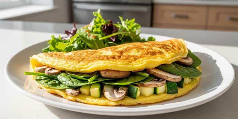 Deux œufs battus avec des épinards, des champignons et des dés de courgette. Accompagnez d’une petite salade verte.