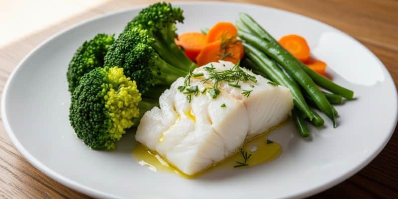 Filet de cabillaud cuit à la vapeur avec un assortiment de brocolis, haricots verts et carottes. Assaisonnez avec des herbes fraîches et un filet d’huile d’olive.
