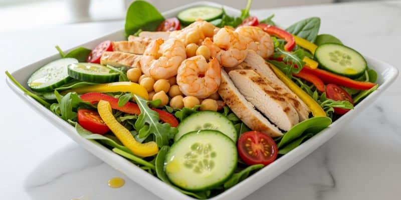 Mélange de jeunes pousses, concombre, tomates cerises, poivrons, avec une portion de poulet grillé ou de crevettes, et une vinaigrette légère à base d’huile d’olive et de citron. Ajoutez quelques pois chiches pour les fibres.