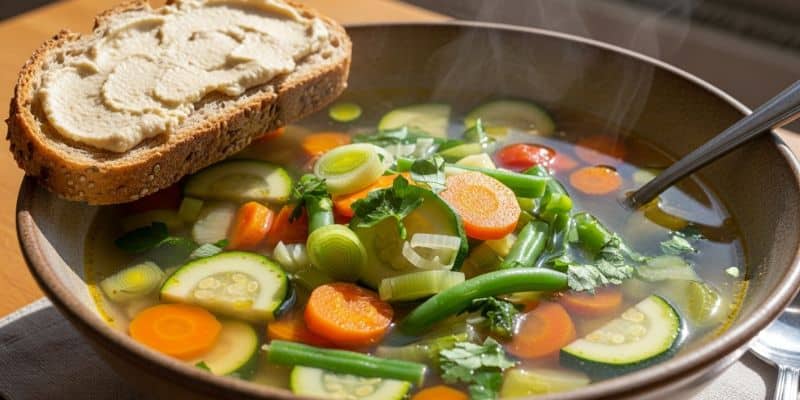 Une grande bol de soupe de légumes (sans crème ni pommes de terre en excès) avec une tranche de pain complet et une fine couche de houmous ou de fromage frais 0%.