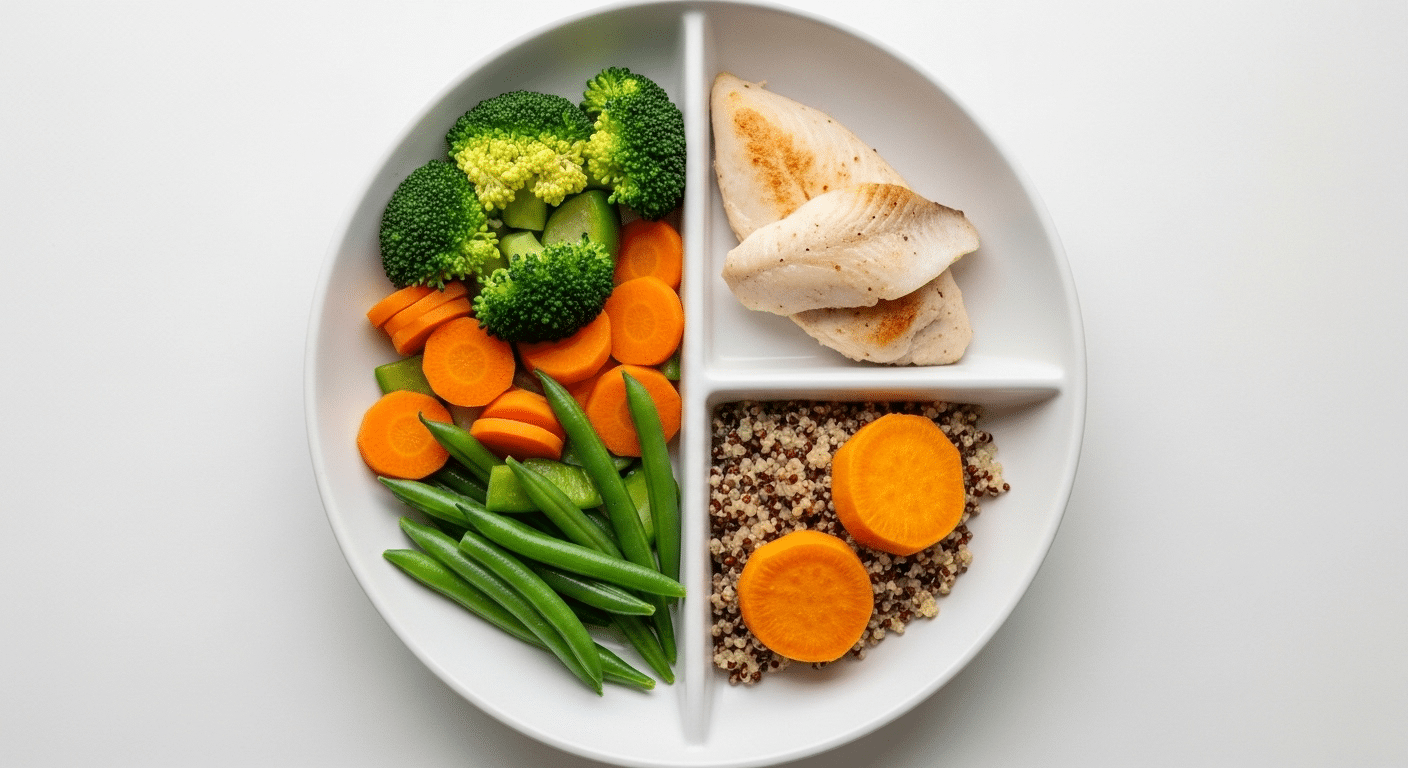 Un quart de l’assiette : Protéines maigres (poisson, volaille, œufs, légumineuses).