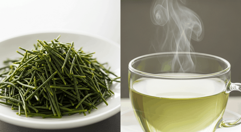 Également ombragé comme le matcha, mais sous forme de feuilles. Il est considéré comme un thé vert japonais de haute qualité, avec une saveur umami prononcée et une richesse en composés bénéfiques, bien que plus onéreux.