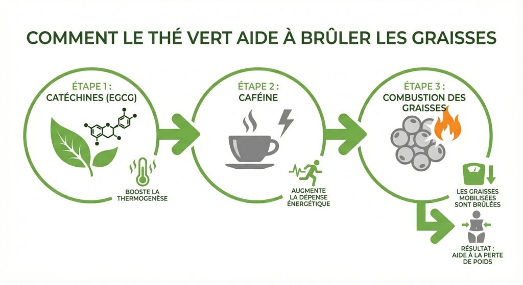Il est crucial de noter que le thé vert ne « brûle » pas la graisse de manière localisée ou miracle, mais facilite la combustion globale des graisses dans le cadre d’un déficit calorique.