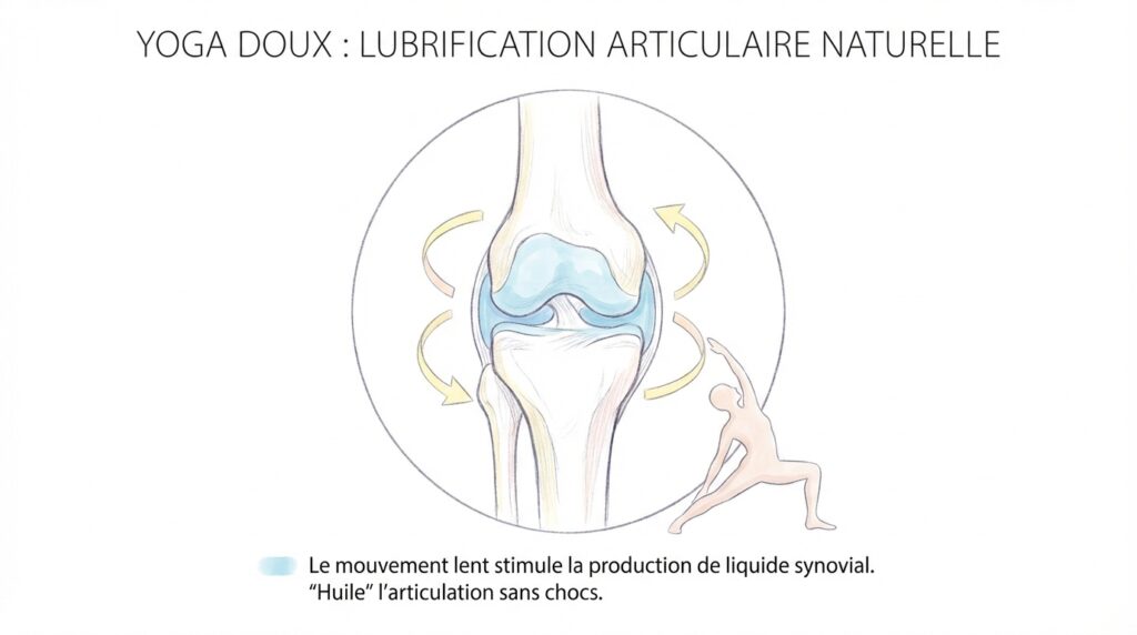 L’une des plaintes les plus fréquentes après 50 ans concerne la raideur matinale ou les douleurs chroniques, souvent liées à l’arthrose ou à un manque de mobilité. Le yoga doux agit comme un lubrifiant naturel pour vos articulations. Contrairement aux sports à impact qui peuvent traumatiser le cartilage, les mouvements lents et contrôlés du yoga stimulent la production de liquide synovial, essentiel pour la fluidité articulaire.