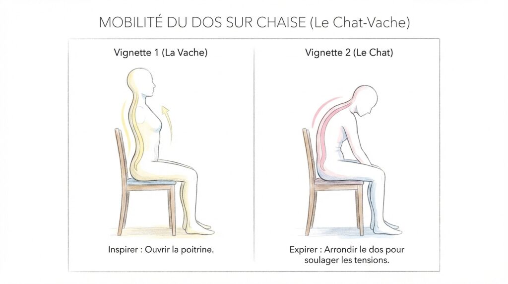 À quatre pattes (ou assis sur une chaise, mains sur les genoux). À l’inspiration, creusez légèrement le dos en regardant vers le ciel (la Vache). À l’expiration, arrondissez le dos en rentrant le menton vers la poitrine (le Chat). Répétez ce mouvement fluide 5 à 10 fois. Cela libère les tensions dorsales instantanément.